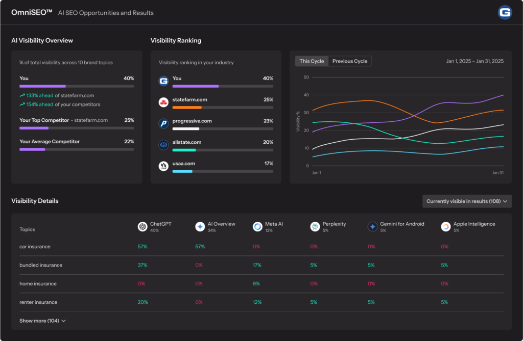 Boost your visibility on ChatGPT, Google AI Overviews, Perplexity, and Claude with OmniSEO® — the only AI visibility monitoring platform paired with expert generative AI SEO services that help you capitalize on AI search. Get ahead of your competitors and show up where your audience searches.