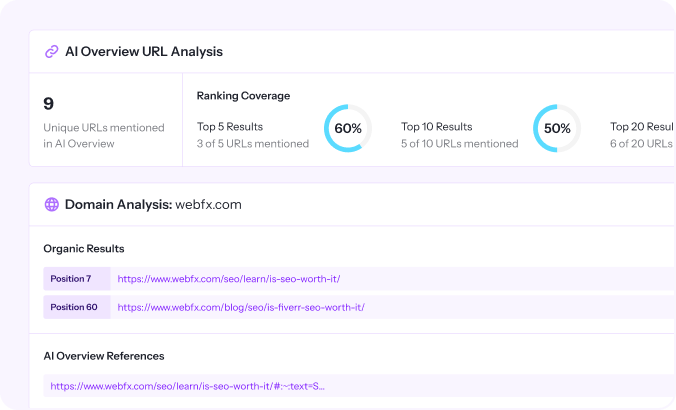 Get a complete picture of your domain’s visibility across both AI Overviews and traditional search results. Our Domain Analysis tool provides a side-by-side view of how your content performs in both environments.